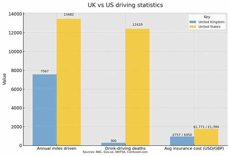 Insurance tells a similar story. In the UK, the average annual premium is about £757 ($950). In the US, average full coverage is about $1,390 (£1,771). Lower costs in Britain suggest fewer accidents and reduced risk overall.